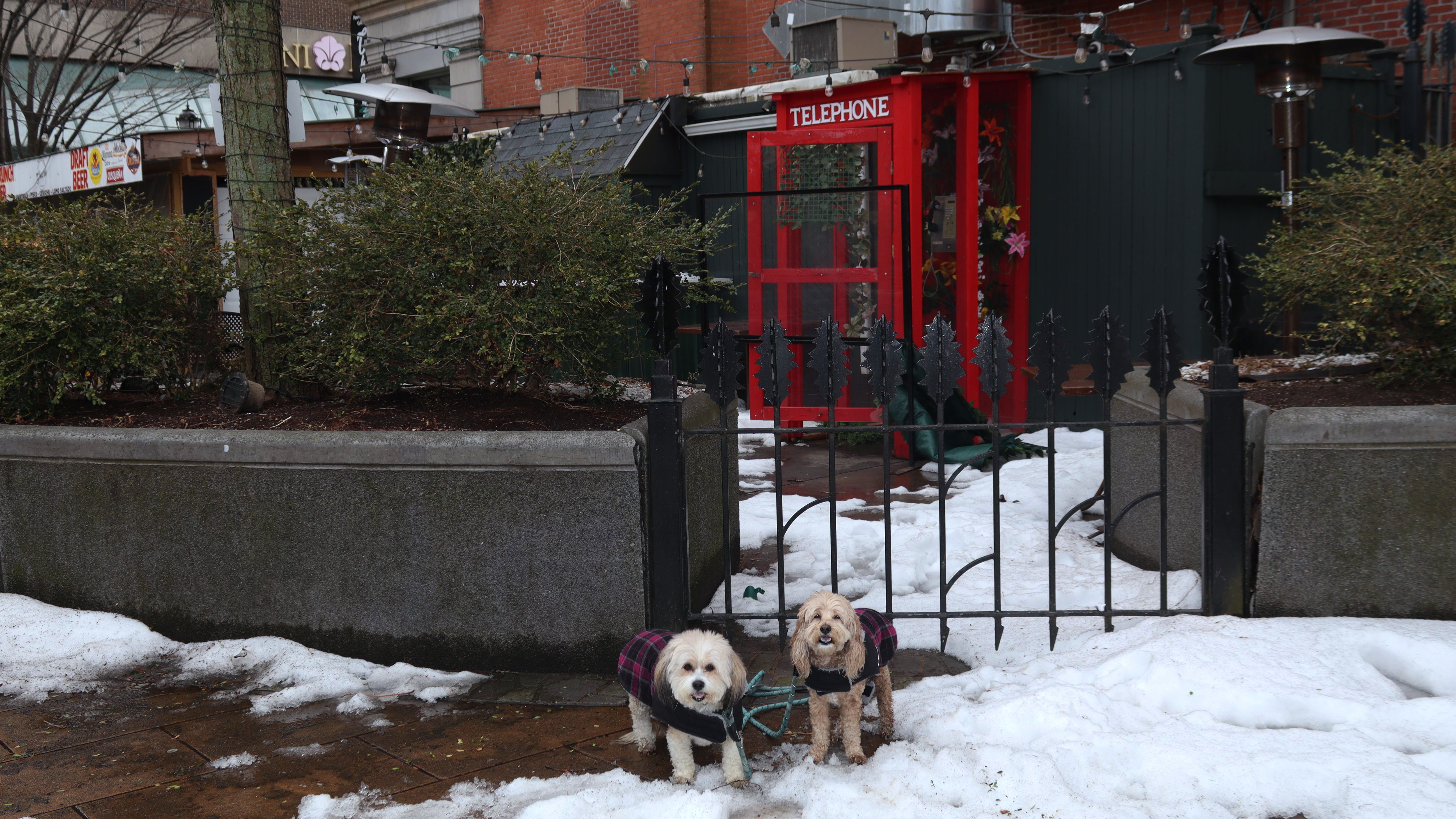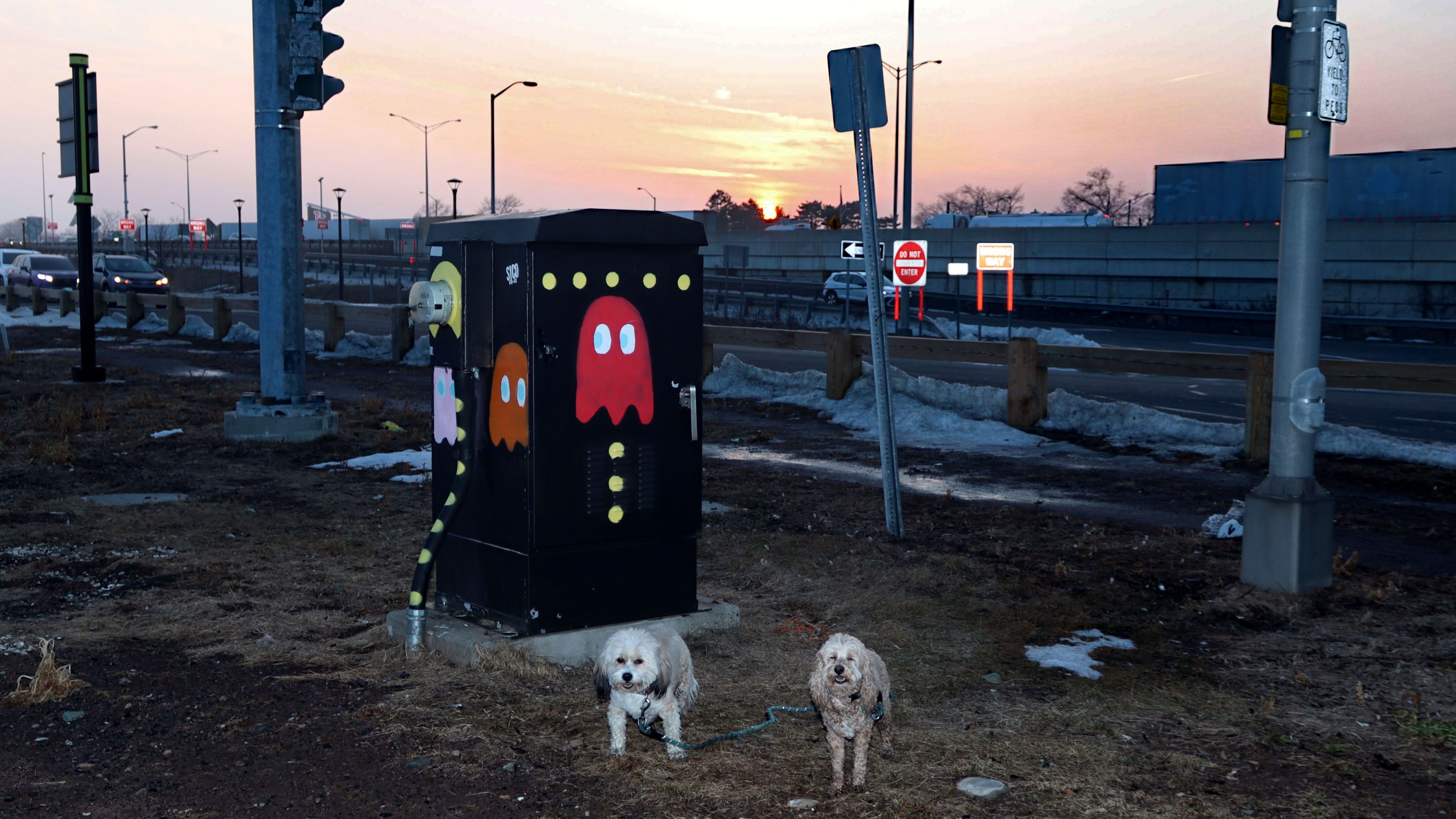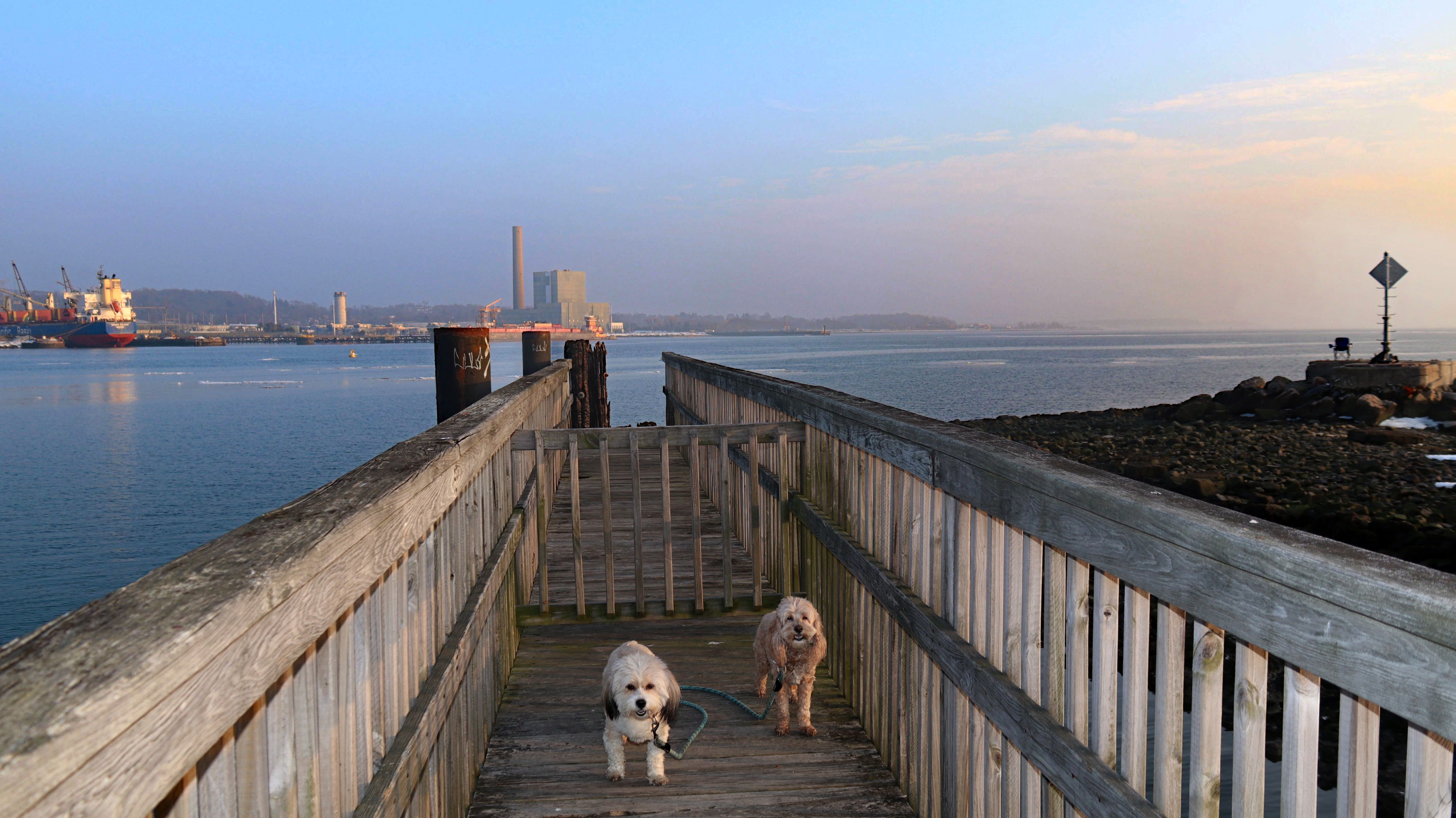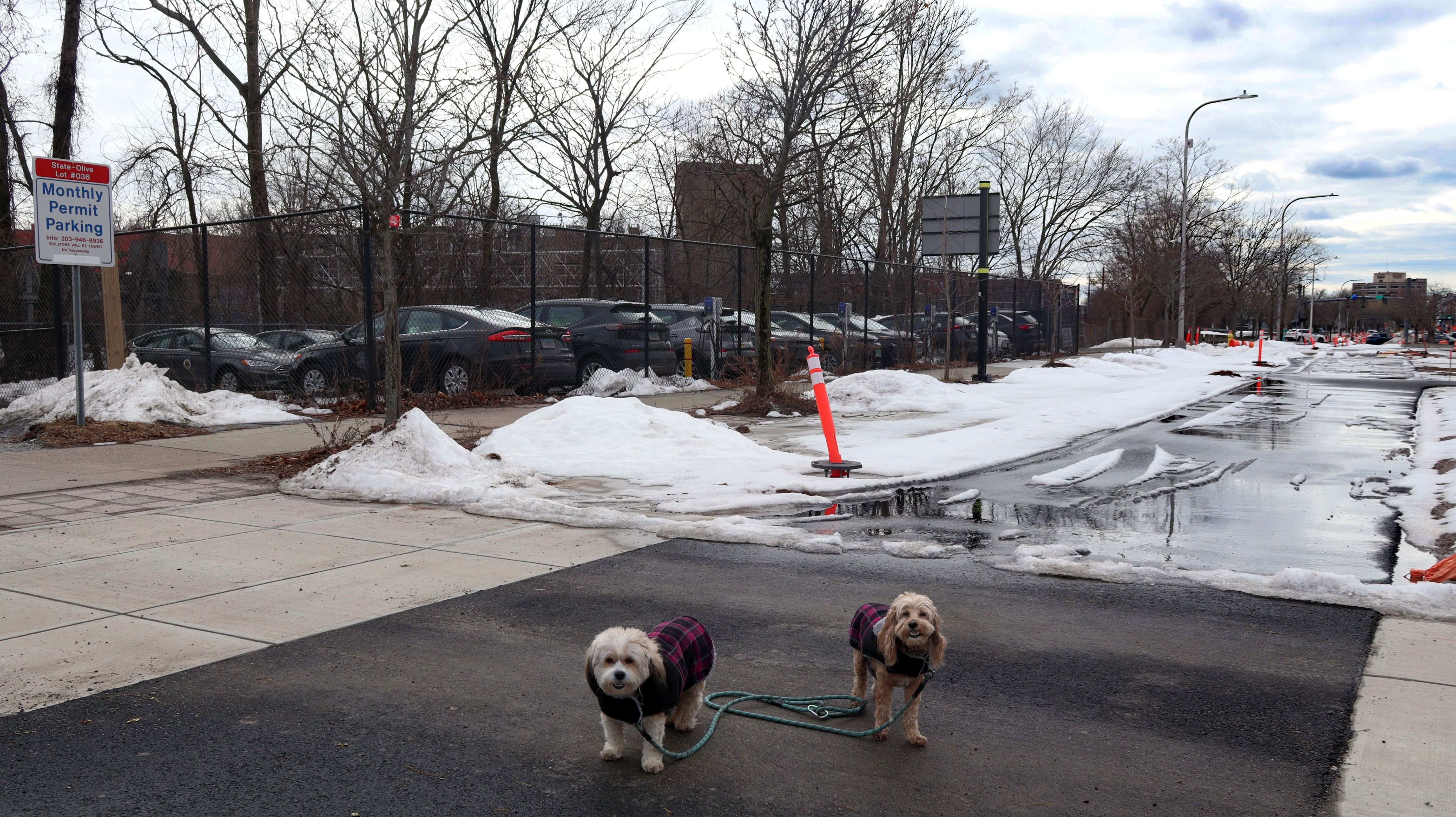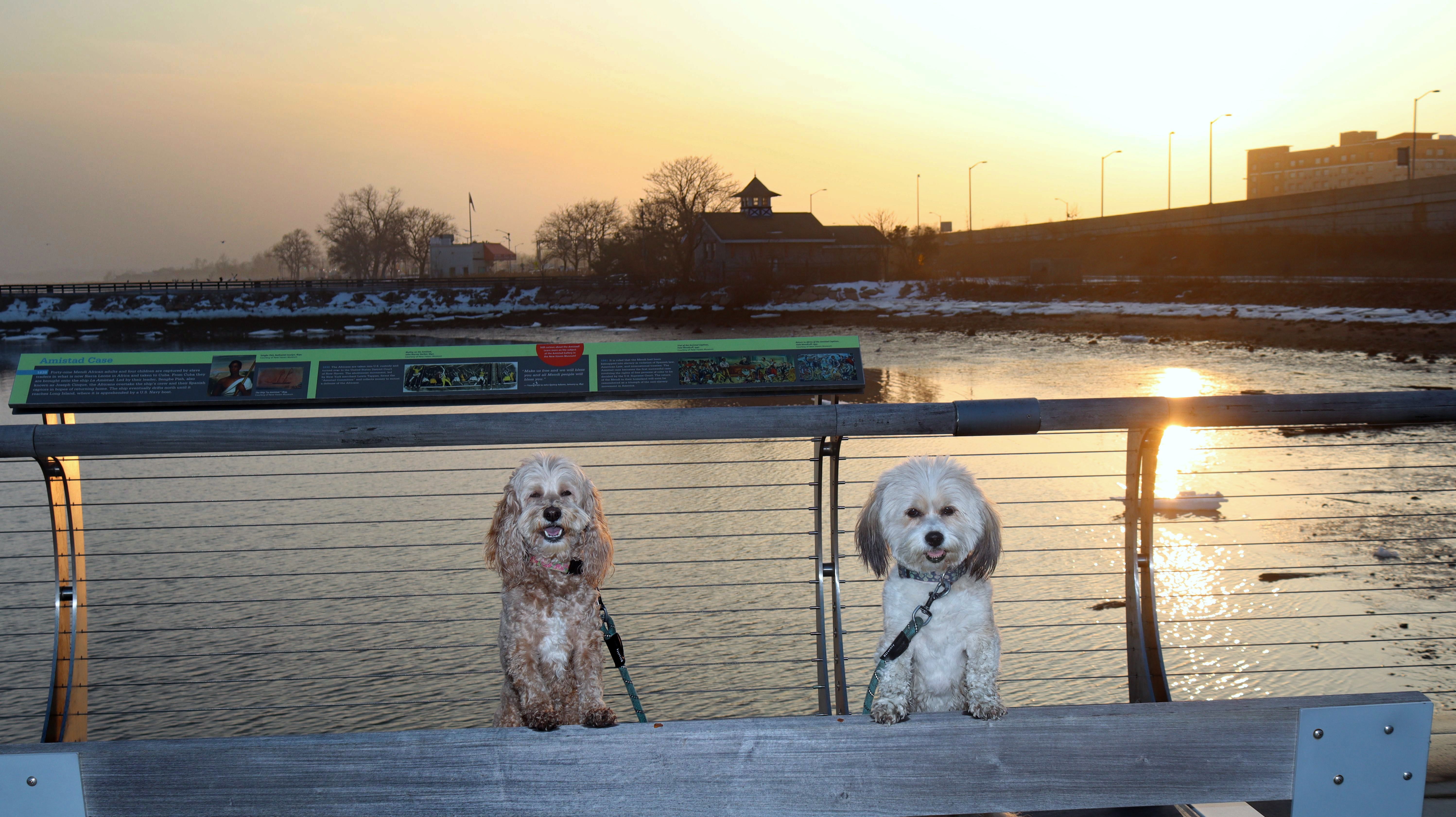 It was gray and gloomy for most of the day. The sun made a brief attempt to break through late in the afternoon, but it only left us with haze and fog, which created some interesting photo opportunities. We had visited before, first back in November of 2020, and later passed through again when we reached the southern end of the Farmington Canal Heritage Trail. It felt strange seeing chunks of ice floating in New Haven Harbor. We walked the full length of the harbor-side walkway, a little over two and a half miles round trip. On the opposite side of the street, food trucks were lined up, but every single one was a taco truck, so there wasn't much variety. The dogs enjoyed the walk, especially Mandy, who made it her personal mission to step in every puddle along the way.
